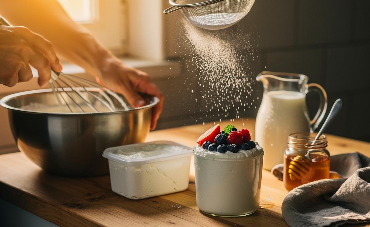 - 🥣 3-Zutaten-Quarkcreme in 10 Minuten: 500 g Magerquark, 150 ml eiskalte Sahne, 40–60 g Puderzucker — mit Schneebesen ohne Handmixer rasch zu einer glatten, luftigen Creme rühren.